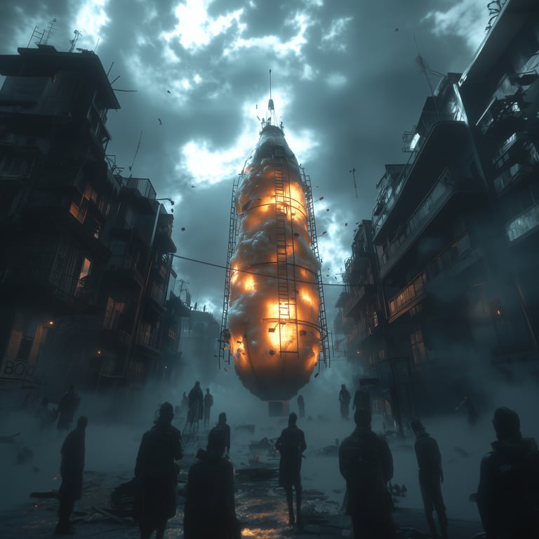 Vieną niūrią dieną su draugu vaikštinėjome po Kauną. Lipome metaliniais Akropolio laiptais ant stogo, norėdami pamatyti panoramą. Žvelgdami į Kauno Žalgirio areną, apimtą „cepelininio dangaus“ (toks oras – pilkas, sunkus, beveik spaudžiantis), mums gimė idėja: o kas, jei ten stovėtų cepelinas kaip erdvėlaivis, su kopėčiomis, į kurias būtų grobiami žmonės?
